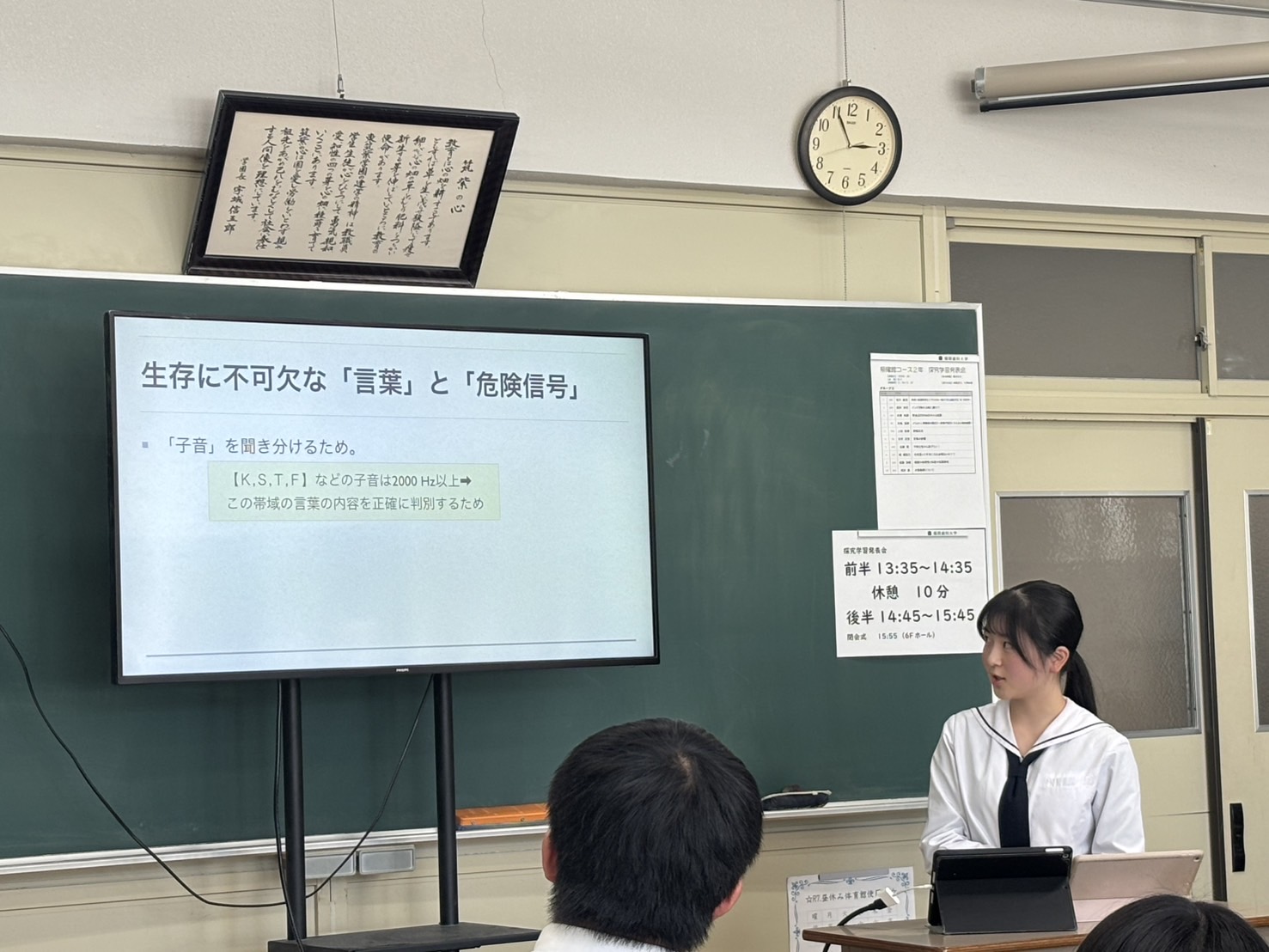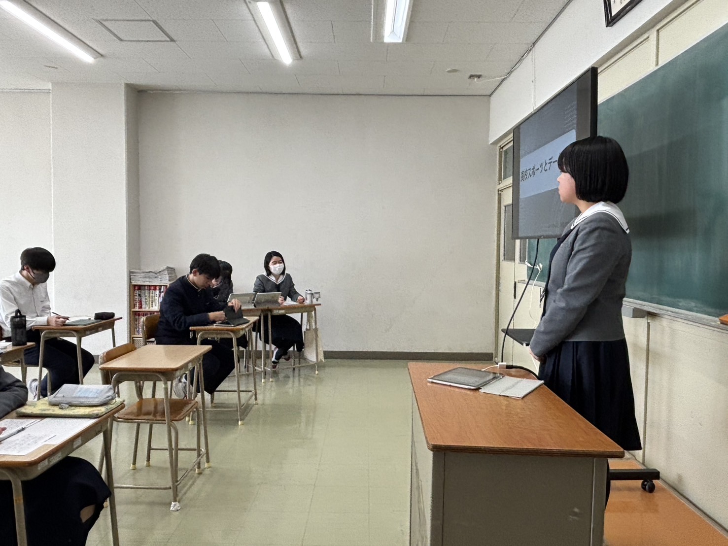 発表後は、シートを用いた相互評価を行い、他者の視点から学びを捉え直す時間も確保しました。また、担当教諭からは内容面に関する講評や感想が述べられ、生徒にとっては次の探究へとつながる示唆を得る機会となりました。進行は選出された司会生徒が担当し、全体を通して主体的に運営されていた点も印象的でした。